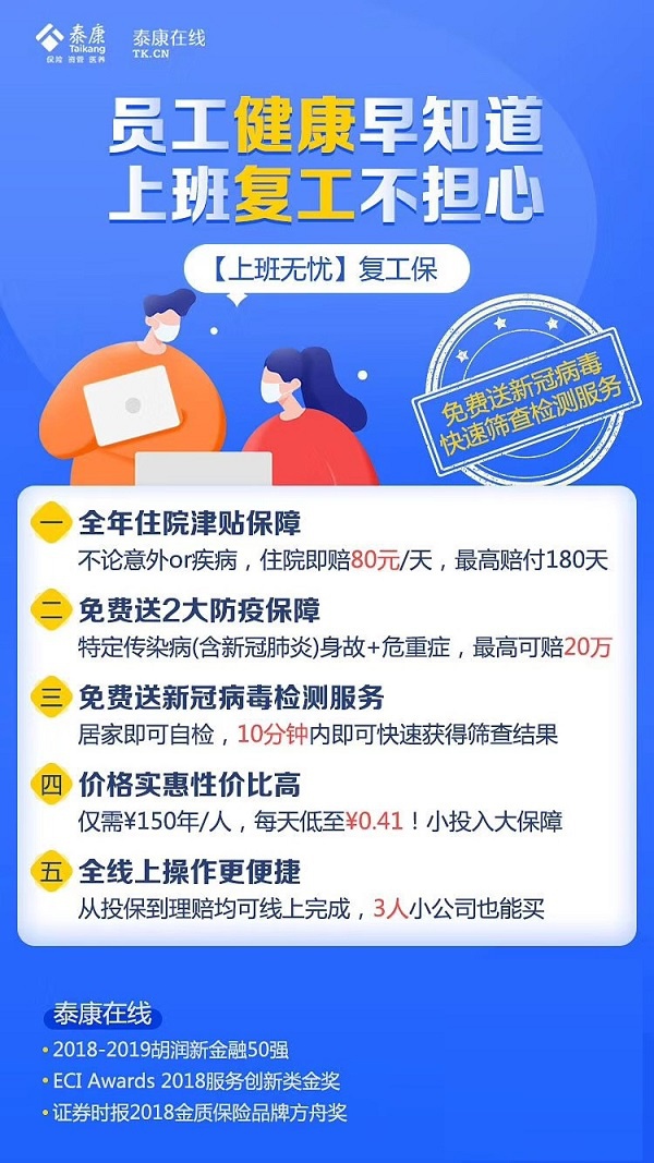 全新“复工保”保险计划分为个人版及企业版,旨在为用户提供一颗复工定心丸。该产品从投保到理赔均可线上完成,可以说是“小成本、零接触、大保障”。