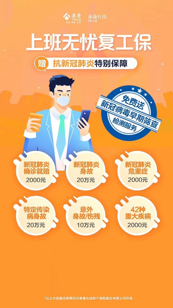 原标题:泰康在线上线“复工保”保险计划 赠新型冠状病毒抗体检测服务 来源:软件资讯网