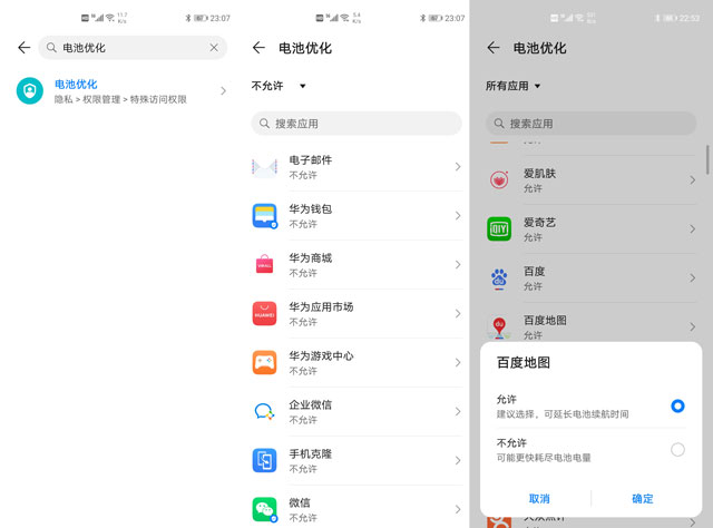 EMUI10中如果有应用在后台比较好点的话,会有一个“高耗电提醒”功能。这时可以选择在后台将该应用关闭。还有另外一个办法就是在系统设置中搜索“电池优化”,然后找到耗电较高的应用,点击后选择“允许”。这样一款高耗电的应用被系统检测到之后,就会被自动关闭,从而节省内存资源。相反,如果这个应用是你不希望被后台“杀掉”的,那么就在“电池优化”中选择“不允许”,禁止系统自动关闭该应用。