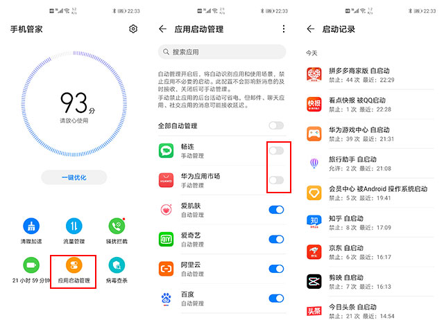 华为EMUI10系统当中,通过自带的“手机管家”APP中的“应用自启动管理”功能,将“自动”改成“手动”。可以限制应用在后台自启。通过这个功能可以禁止不必要的应用在后台偷偷启动,从而节省内存资源。不过该功能的默认选项就已经可以限制大部分应用的后台自启了。在这里也可以看到每一款应用后台自启的情况,可以从中找出自启特别频繁的应用,如非必要的话可以将它删除。