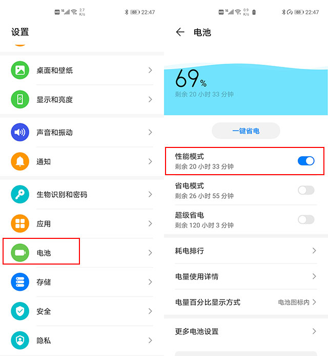 华为EMUI10的电池选项中,有一个“性能模式”,开启这个功能后手机的耗电量会有所增加,但相对的系统对CPU和内存资源的控制会更加放松,从而让后台可以同时运行更多的应用程序,“杀后台”的现象也会相应减少。